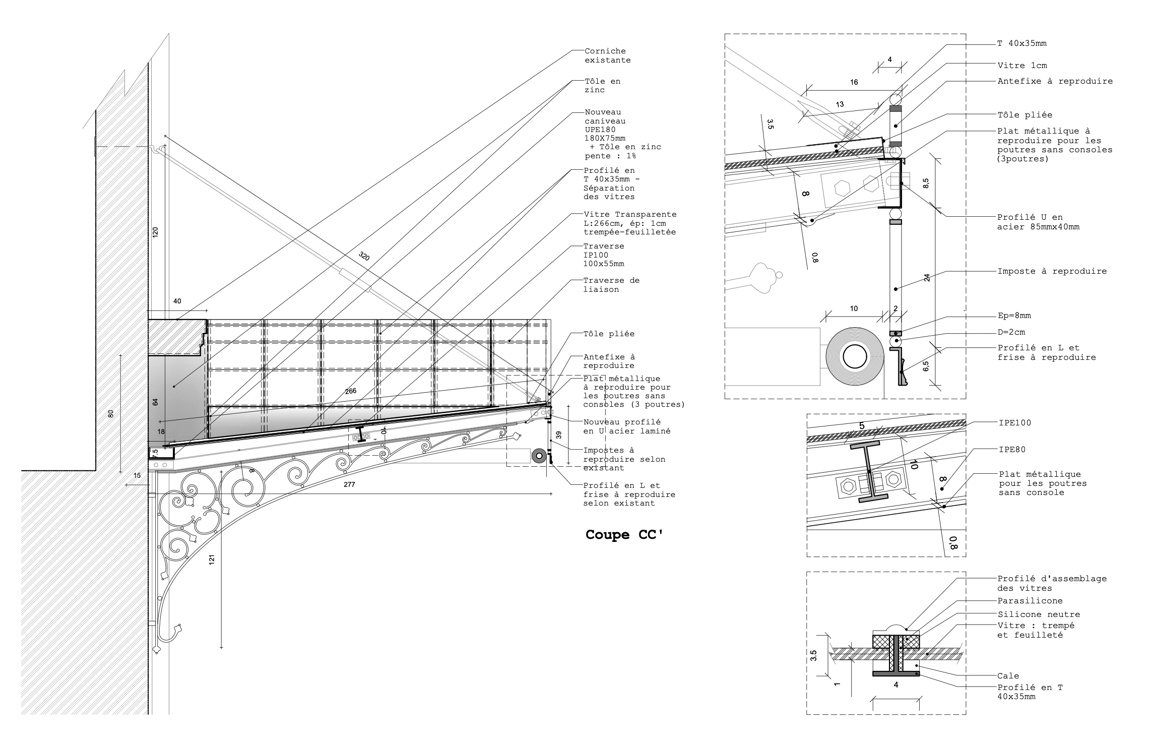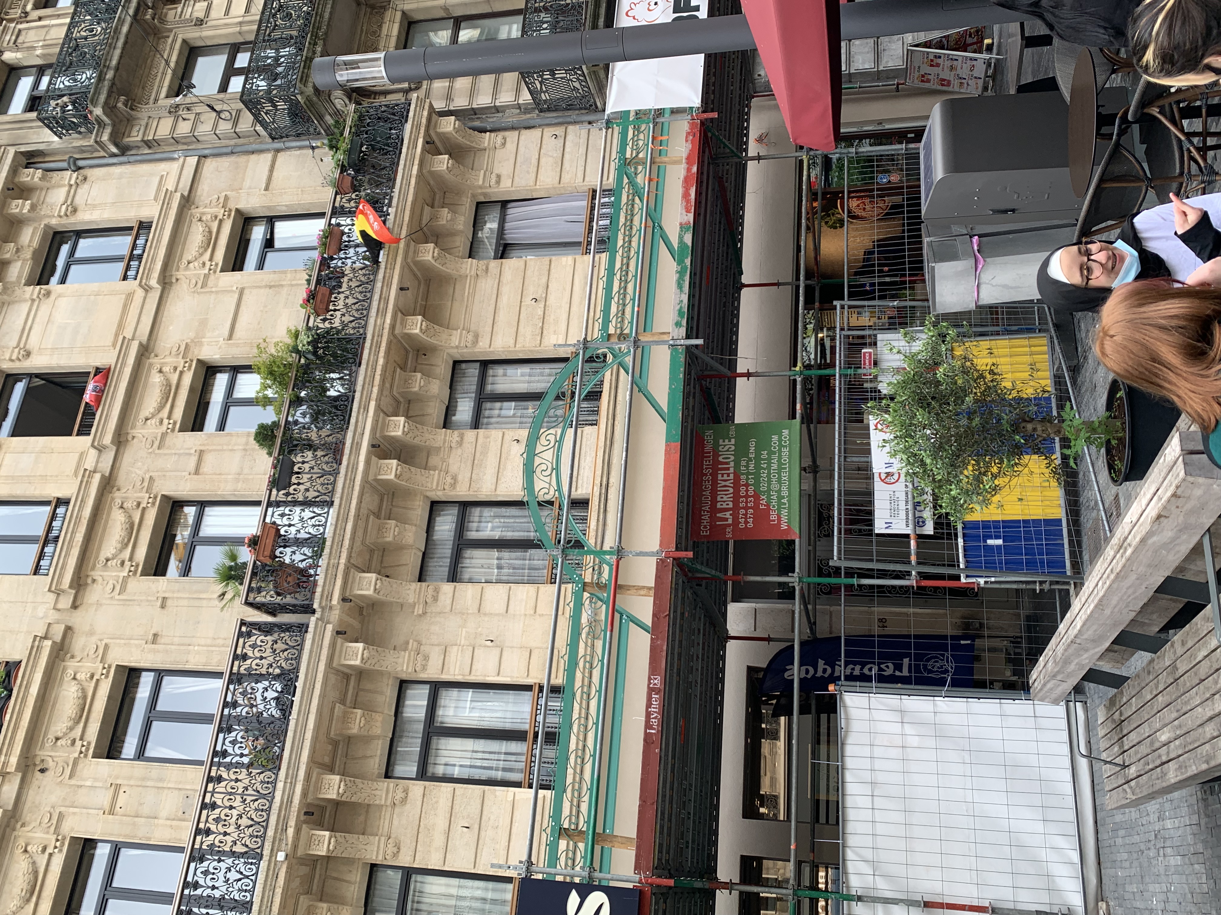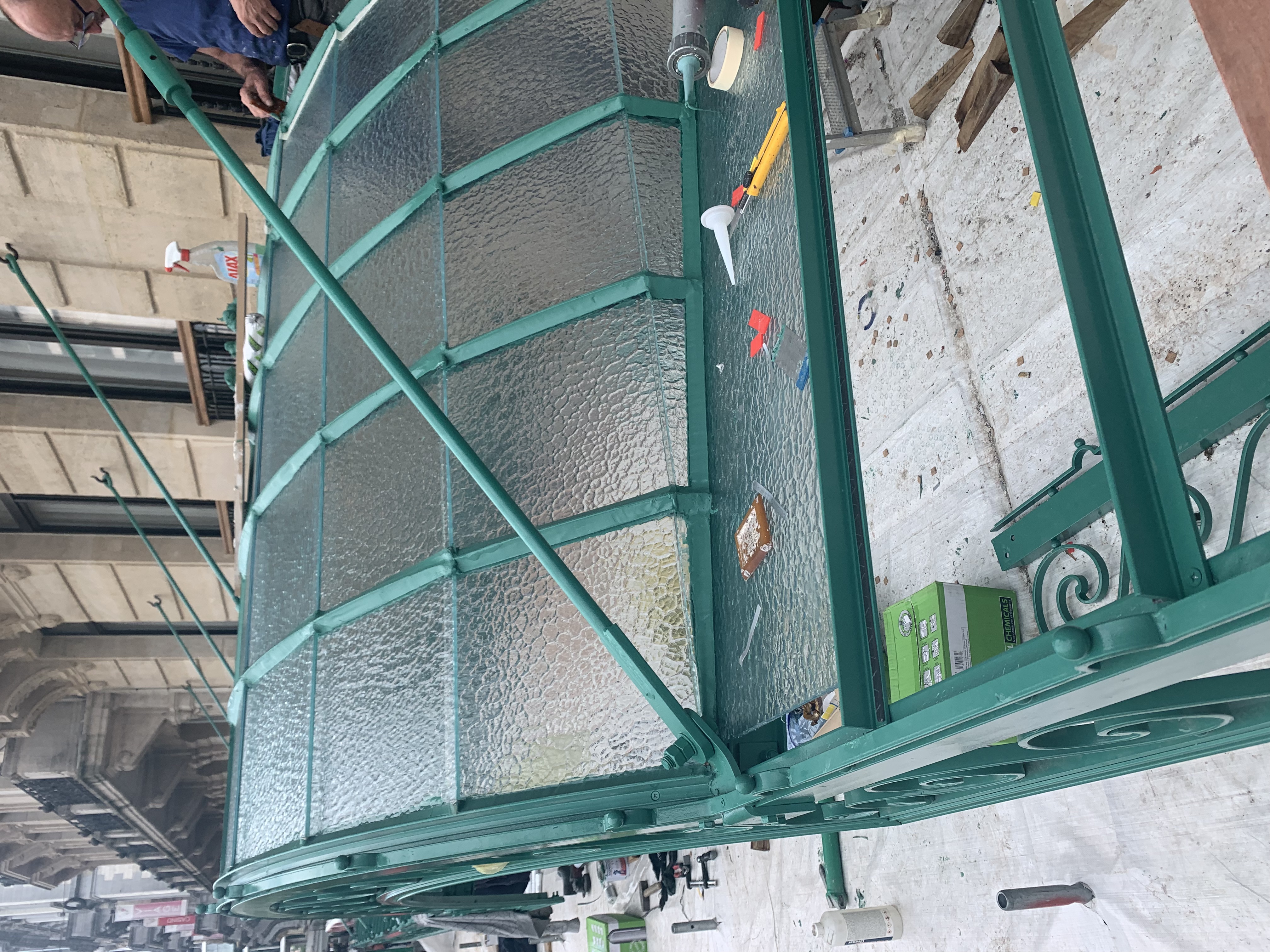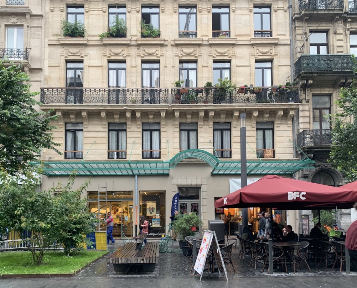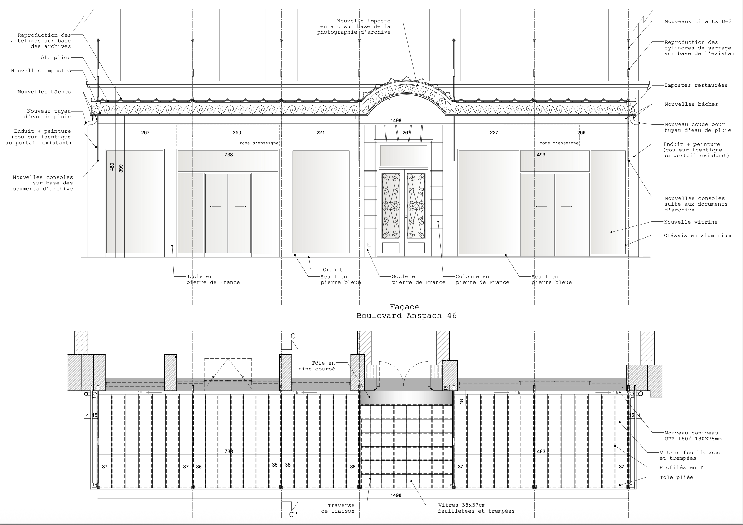 As part of the redevelopment of Boulevard Anspach, the City of Brussels requested the removal of the existing canopies — an intervention that uncovered an original canopy, partially preserved beneath a later structure. The project evolved into a faithful restoration and reinstatement of the historic canopy. Original metal elements — columns, beams, tie rods, and crossbars — were carefully dismantled and restored by a craftsman specializing in iron work.