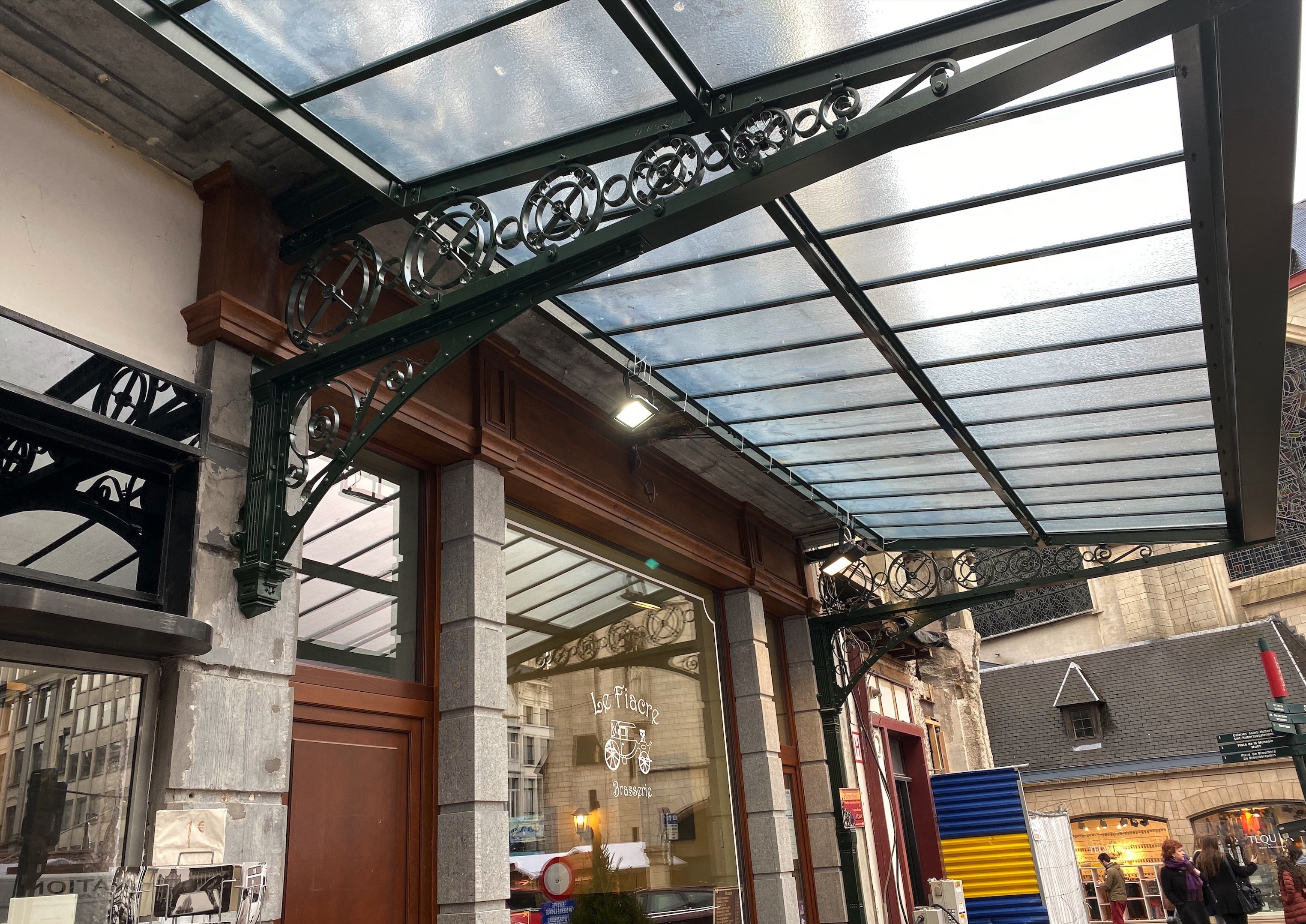 Two specialist teams — each composed of architects, engineers, and metalworkers — carried out the work in collaboration with the City of Brussels, heritage researchers, and conservation specialists. The challenge was to reinstate canopies faithful to their originals using artisanal metalwork expertise, while meeting contemporary safety standards for glazing and structure, and maintaining architectural coherence throughout.