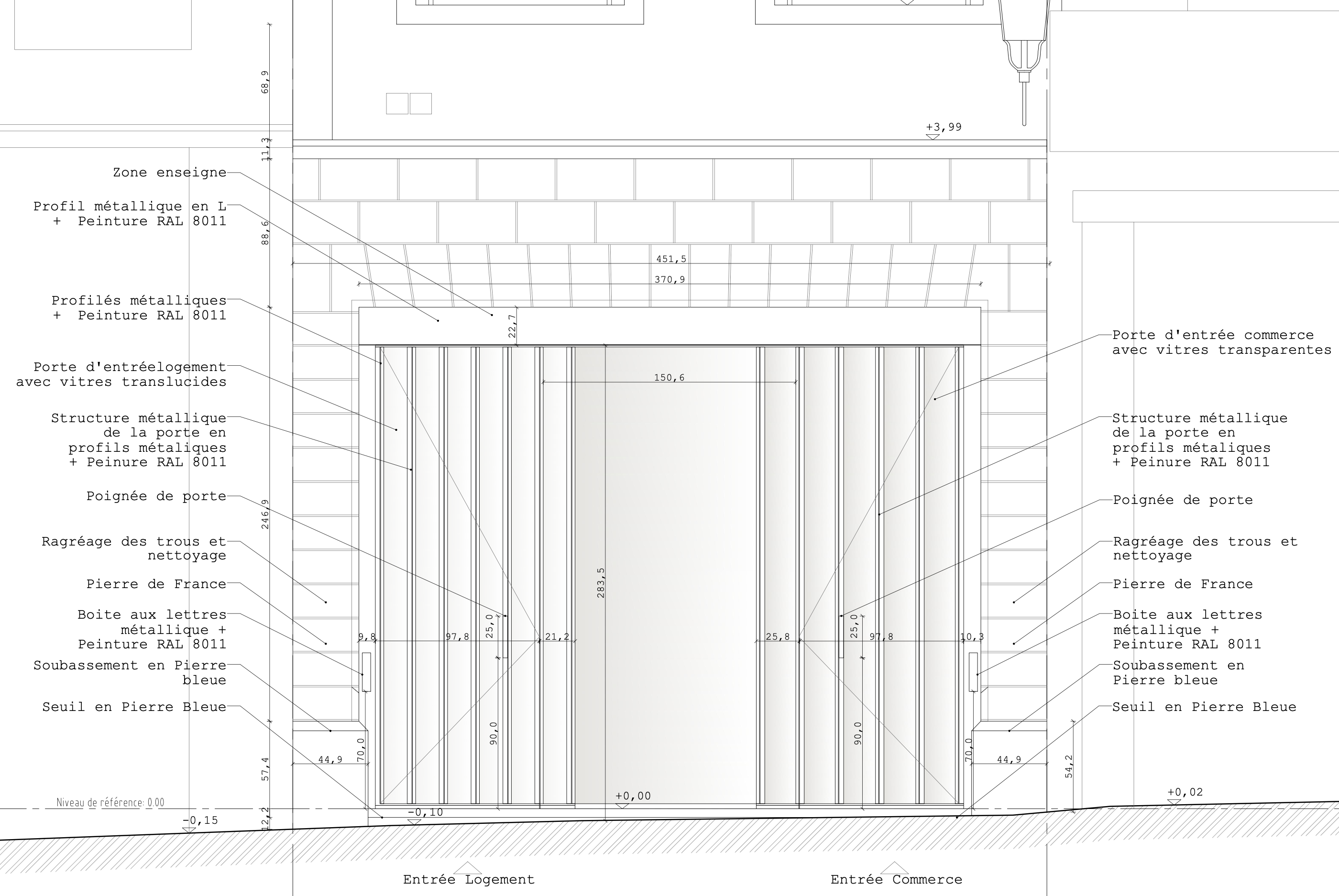 The design centers on the complete transformation of the storefront. Three fixed glazed elements — a display window, acommercial entrance, and a residential entrance —evoke the layering of a Japanese curtain through a subtle offset of planes and a nuanced arrangement of vertical frames: wider on the commercial side for visual openness, narrower on the residential side for privacy. Inside, a glazed partition between the commercial area and the residential corridor extends the perception of a unified display window from the street. This attention tolightness and visual continuity allows the contemporary intervention to integrate seamlessly into a protected heritage environment, subject to strict rules on composition, materials, and execution.