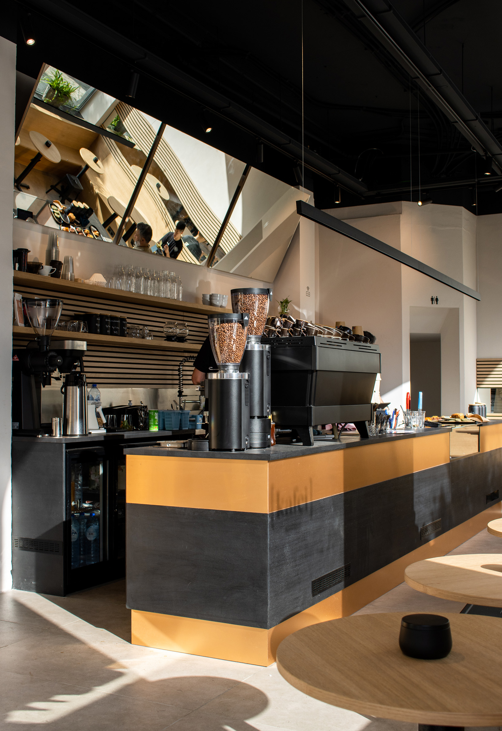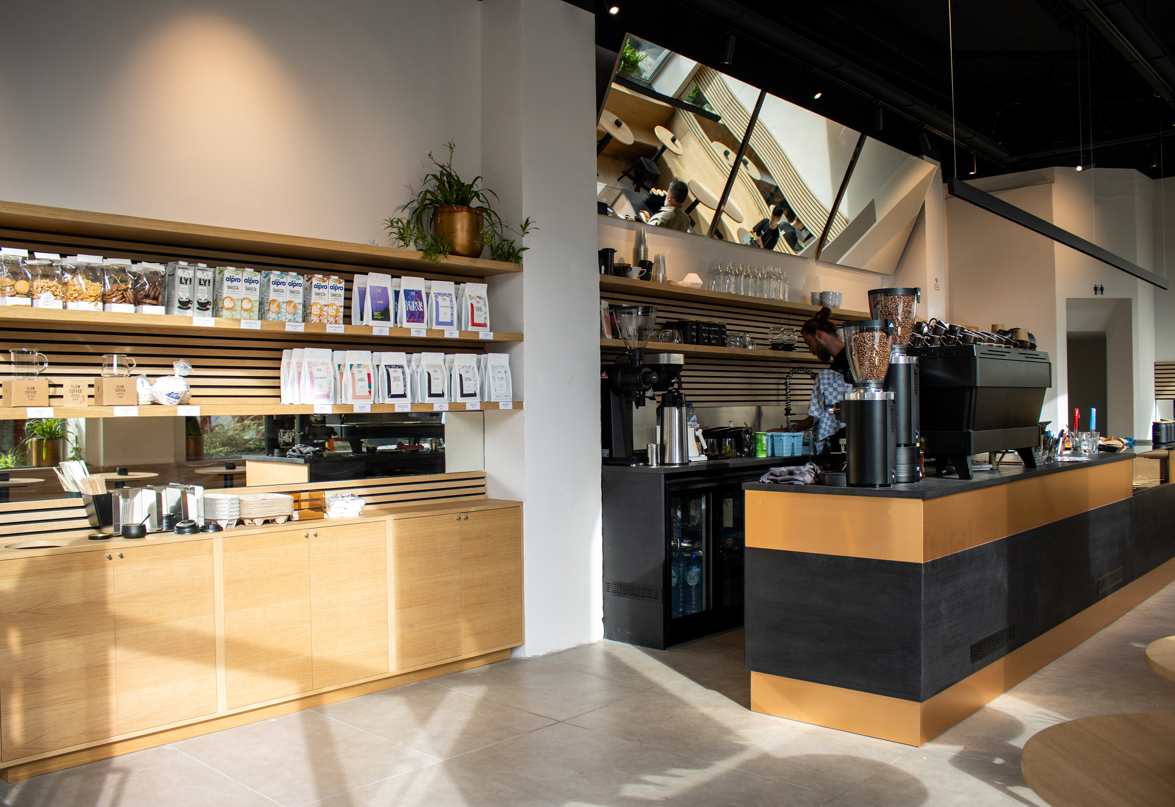 The interior is defined by its use of light-toned wood, applied throughout to unify walls, furniture, and shelving. At the heart of the café is a striking central bar crafted from polished copper—serving as both a visual anchor and a functional centerpiece.