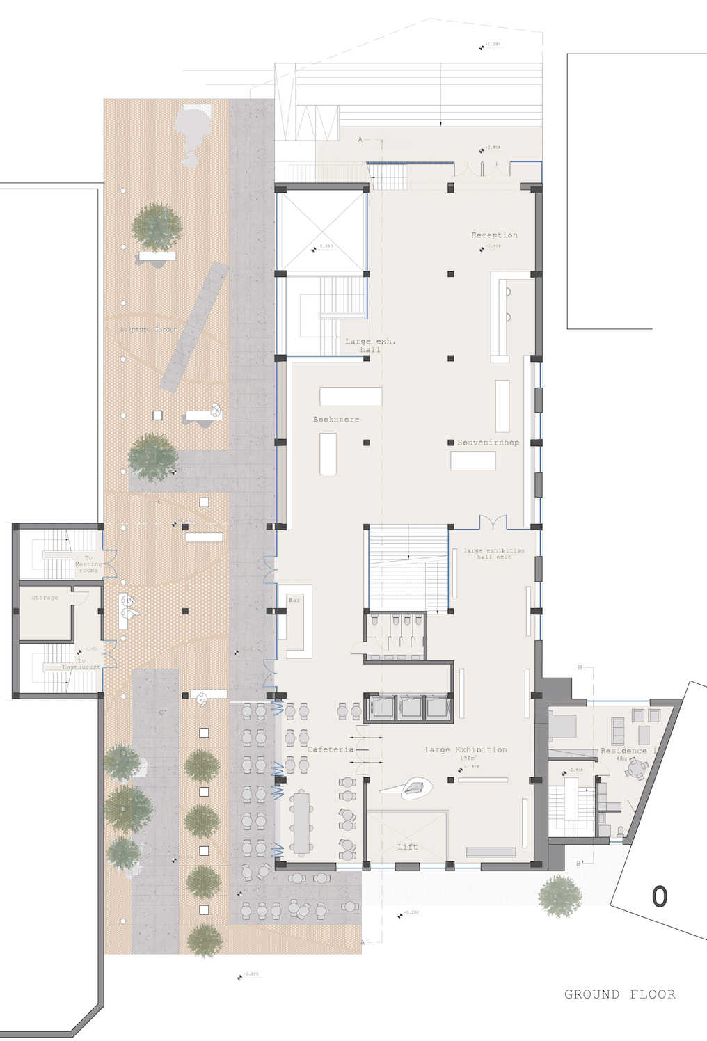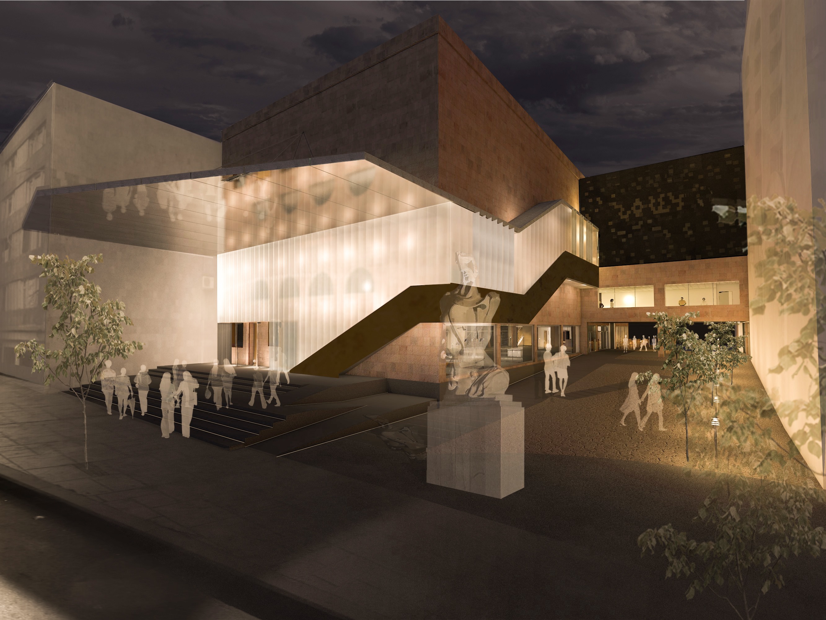 The project is composed of two main volumes: the central building, accessible to the general public (housing the theatre, exhibition spaces, etc.), and the adjacent building, reserved for members, artists, and program participants. Circulation is deliberately fluid, fostering interaction between functions and users.