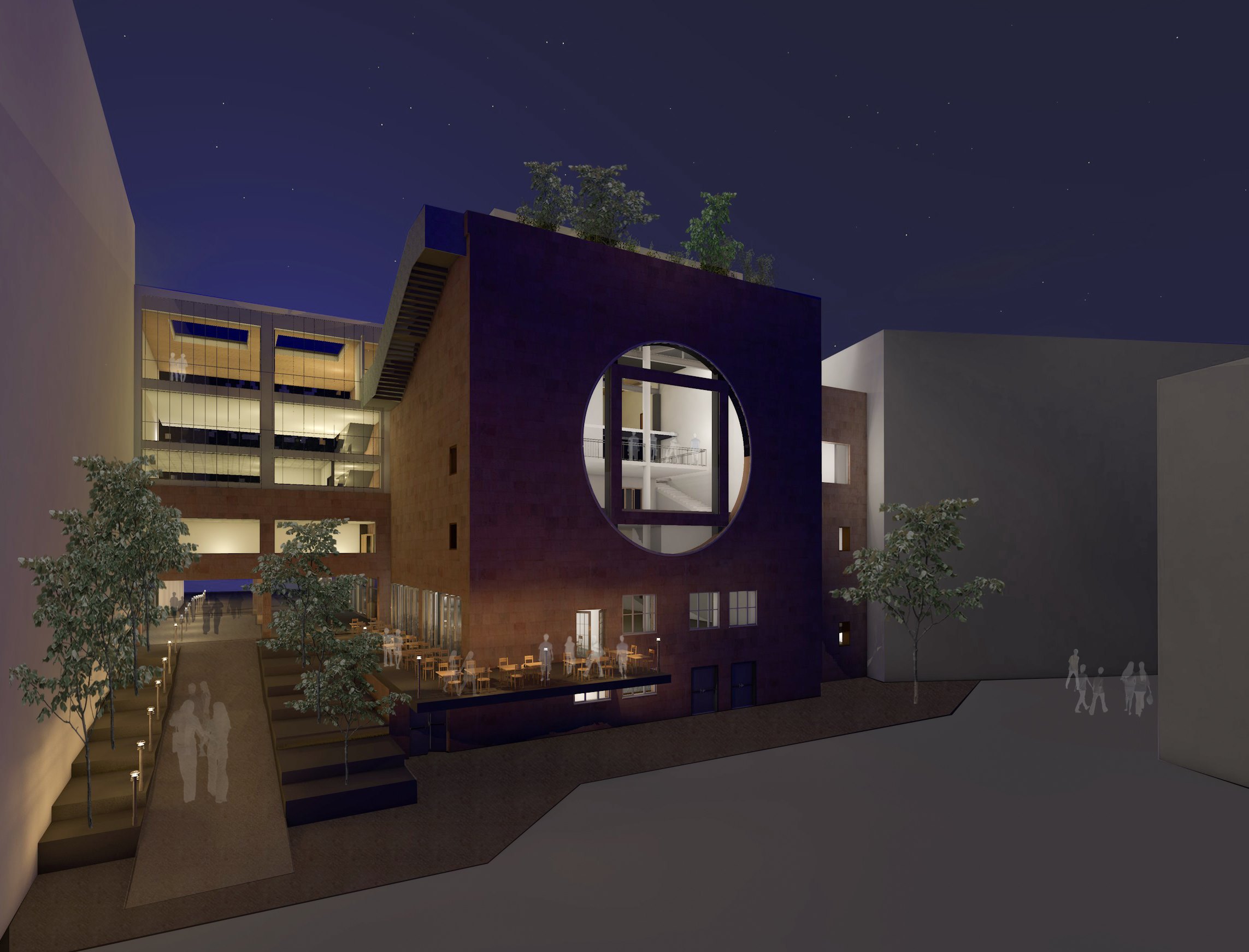 Adaptability is central to the design. Modular and reconfigurable spaces accommodate a variety of programs and support transformation over time. A key architectural gesture—a grafted staircase—threads through the project, connecting indoor and outdoor spaces, and leading to a rooftop terrace and winter garden.