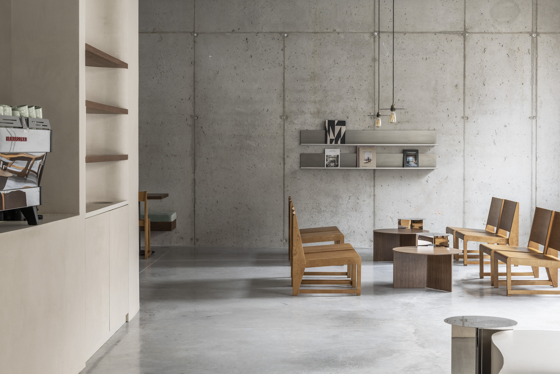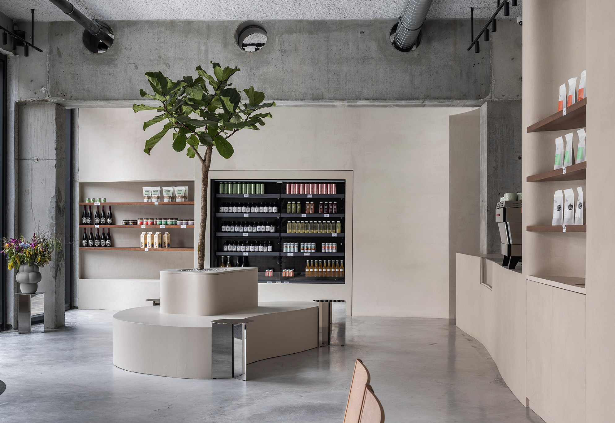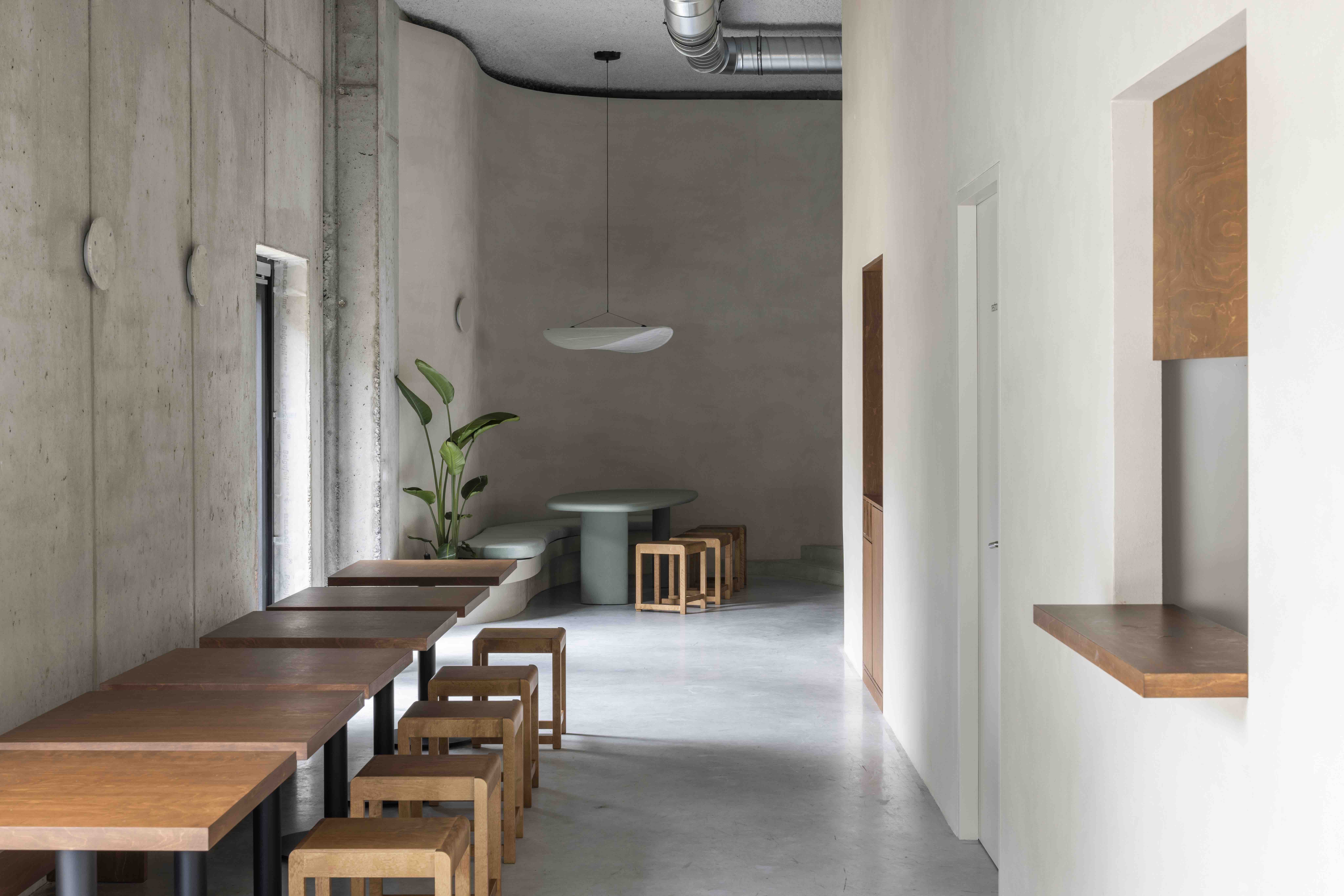 Minimalism here is spatial, not aesthetic: function and material expression define the atmosphere. A central bench with an organically shaped planter greets visitors at the entrance, leading to a long counter. Seating is organized into four distinct zones: a reading lounge with low chairs and stainless-steel shelving; two-person tables along a curving wall; a sculptural group table echoing the building’s geometry; and a quieter work-oriented corner facing a landscaped inner courtyard.
