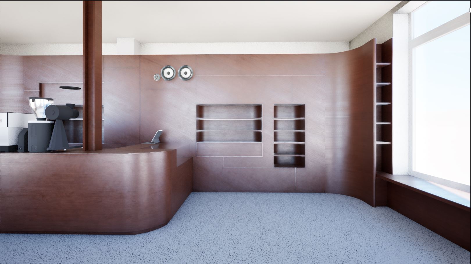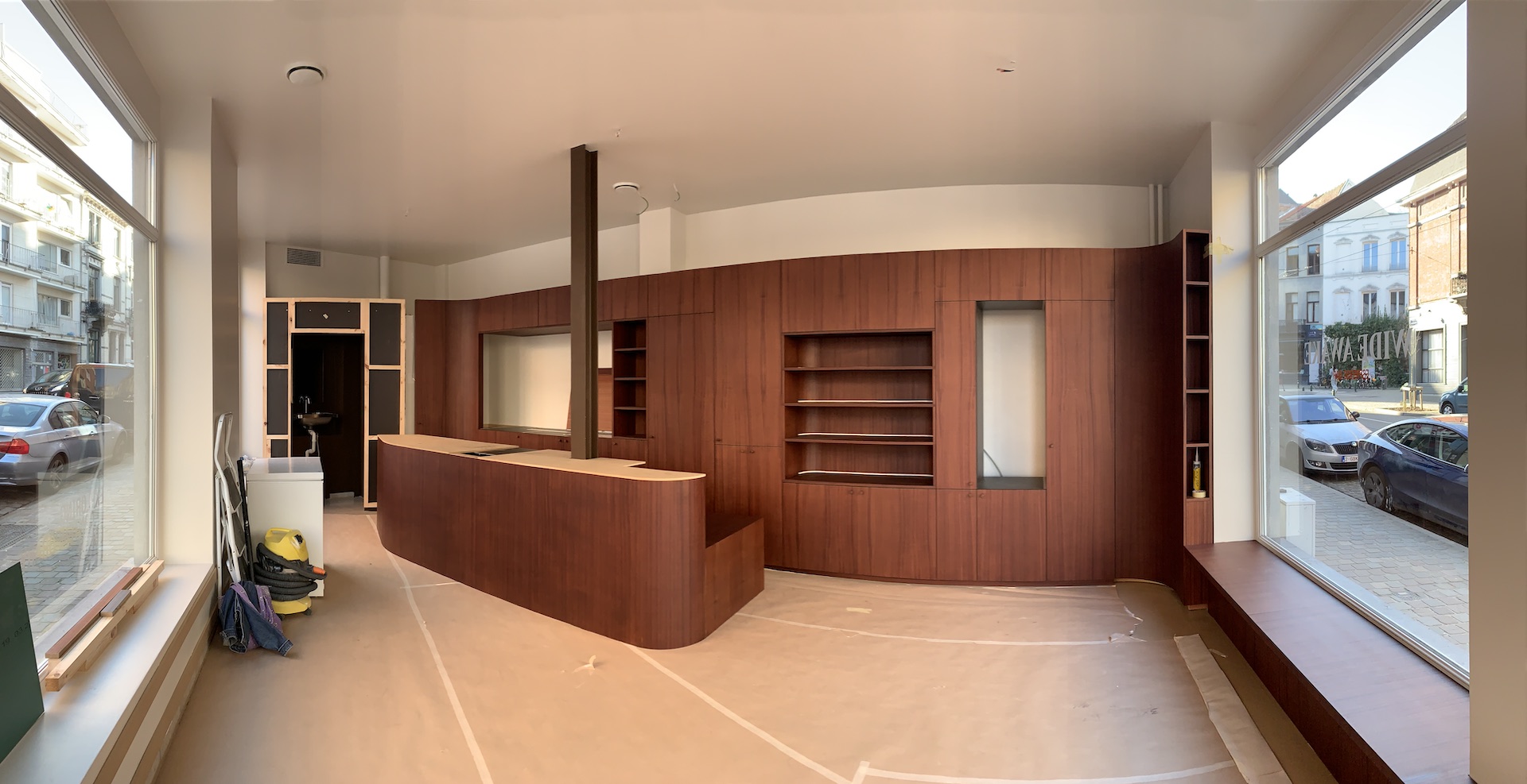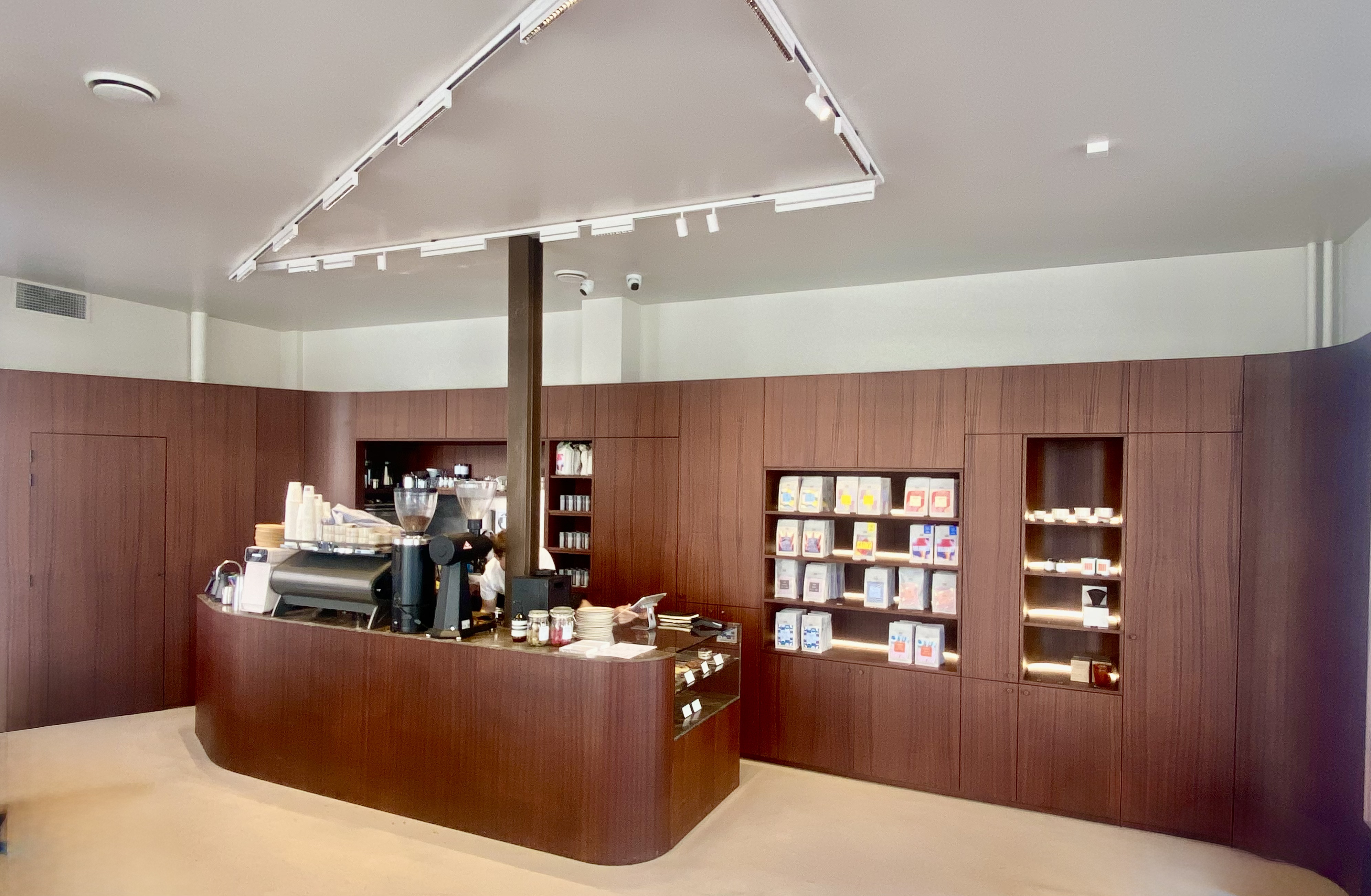 The design resolves a core constraint — the need for substantial storage — through a single bespoke wooden cabinet that integrates retail shelving, bookshelves, technical components, and back-of-house storage in one coherent element. Seating runs along the windows, creating a natural dialogue between interior and street.