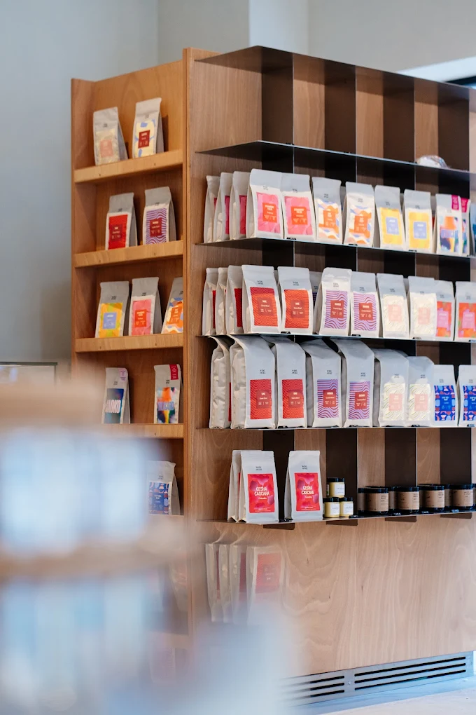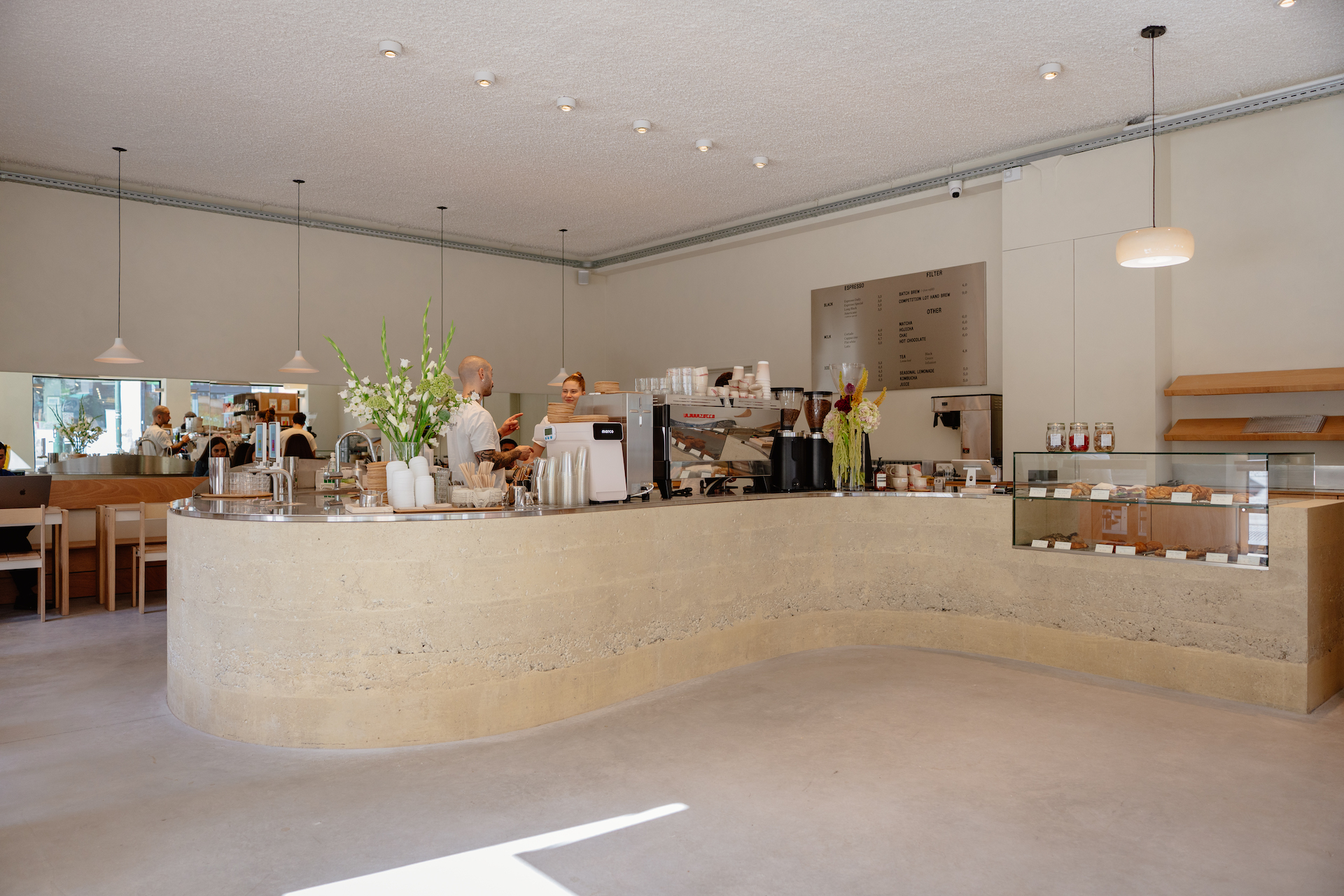 The central counter, made of layers of varying concrete densities, expands as a central piece to precisely fill its space, intuitively guiding the flow of visitors toward the seating area. An open entrance zone gives customers a moment to take in the space upon arrival.