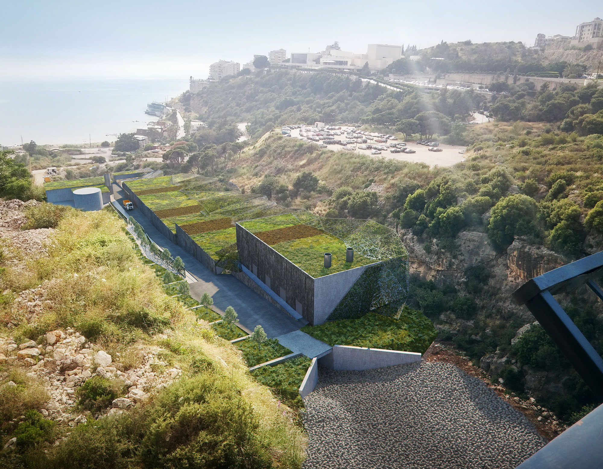 Our intervention does not intend to dressor coat the technical buildings with local/traditional materials and pretend to integrate them into the existing urban environment, but to dissolve them as much as possible in the existing natural environment in order to let the valley prevail the landscape